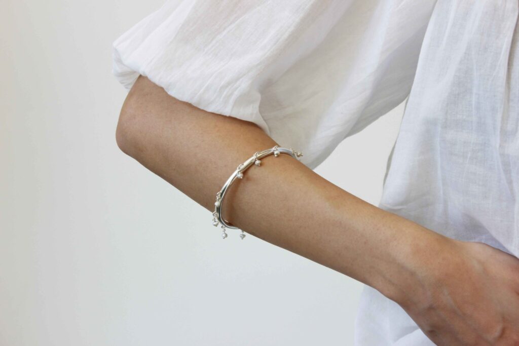 £235.00 £265.00Price range: £235.00 through £265.00Embrace elegance with the Celestial Pearl Charm Bangle, a beautifully handcrafted silver bangle bracelet adorned with delicate dangling freshwater pearls. The organic, slightly…