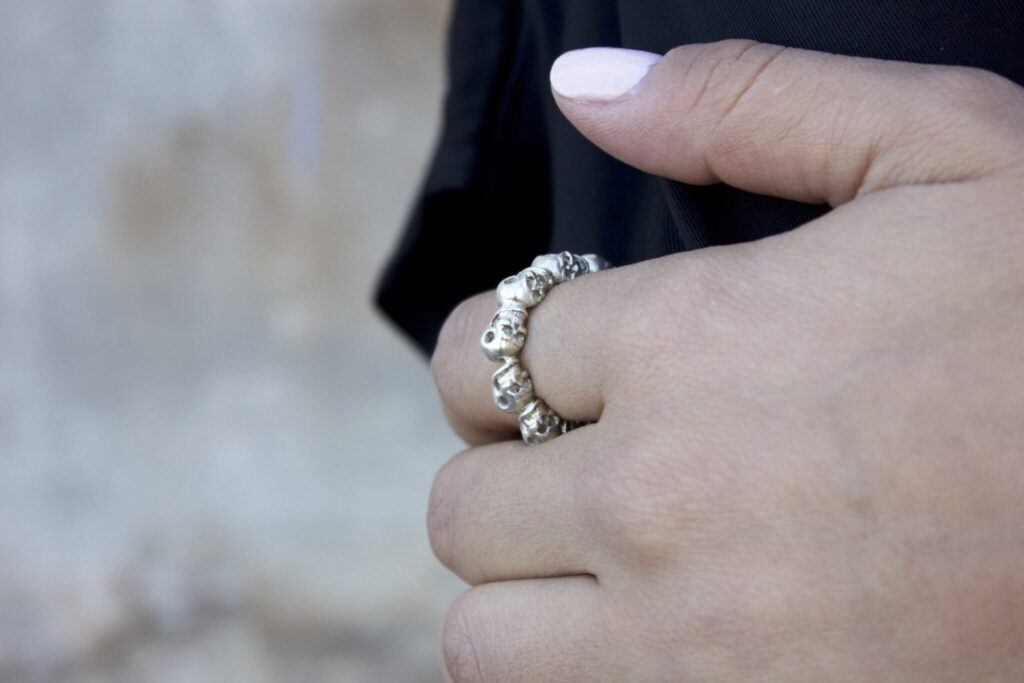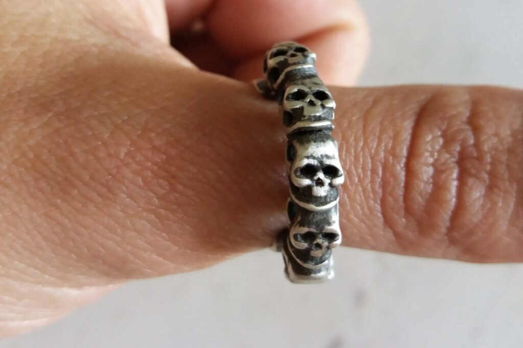 This is a one of a kind full skull ring. The ring features ten small sterling silver skulls attached one by one, and…