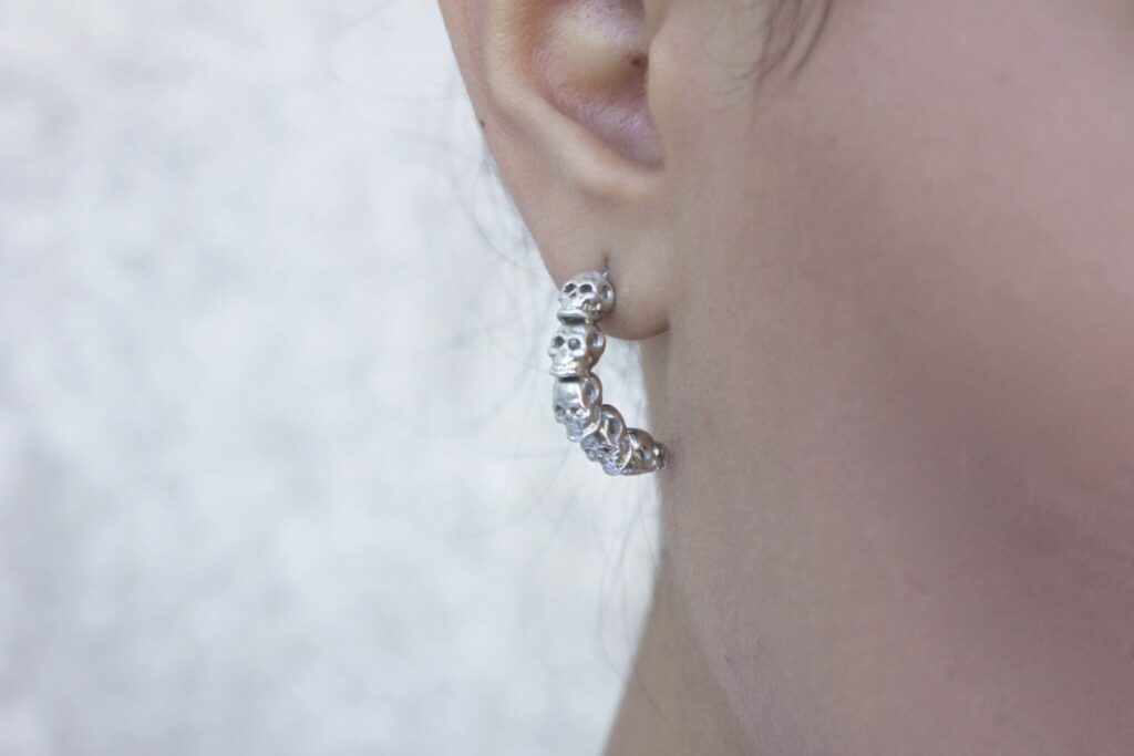 These unusual, dark, yet beautiful skull hoop earrings can add a rock detail to your look. The tiny silver skulls are soldered together in…