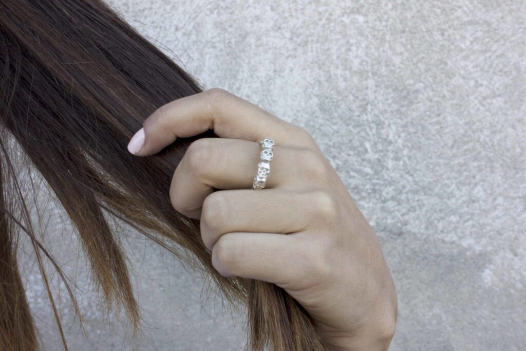 A contemporary silver skull ring featuring a row of four skulls. This unique, unusual yet beautiful ring can add an elegant detail to…