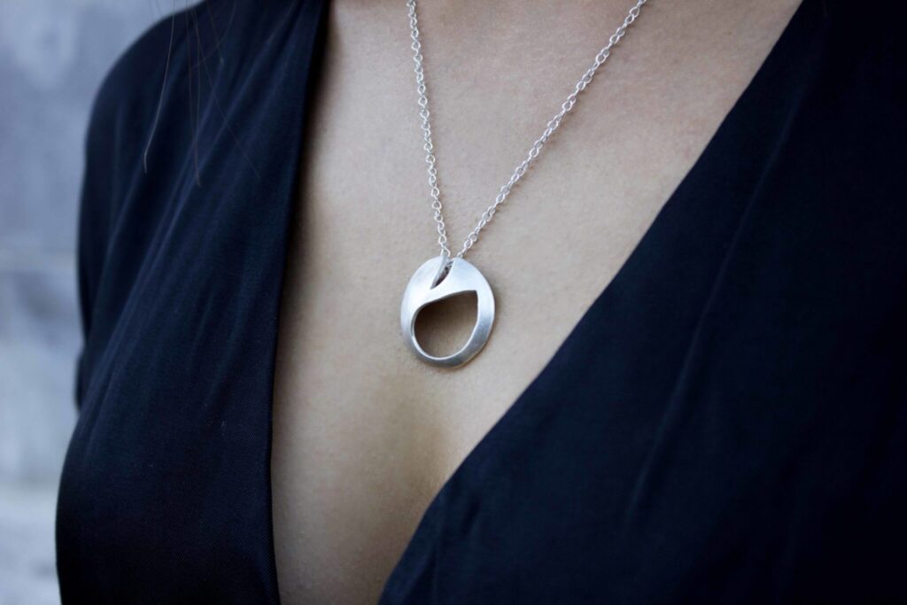 Sterling silver geometric, minimal necklace from our Post Punk collection. Diameter 3cm Chain length 48cm The shape comes from a deformed interpretation of…
