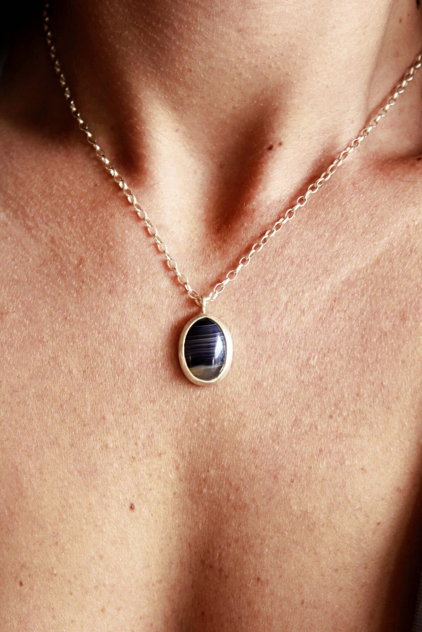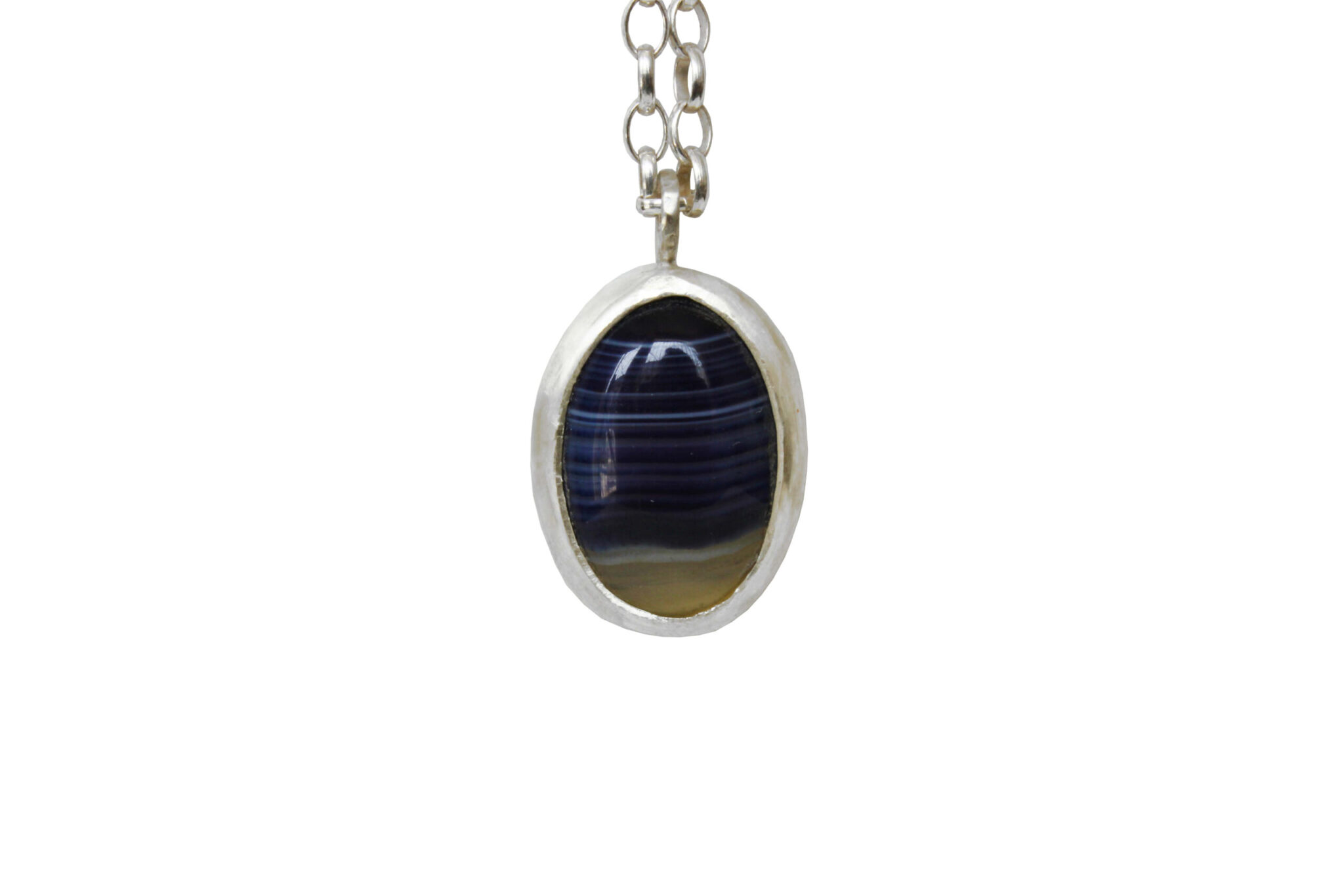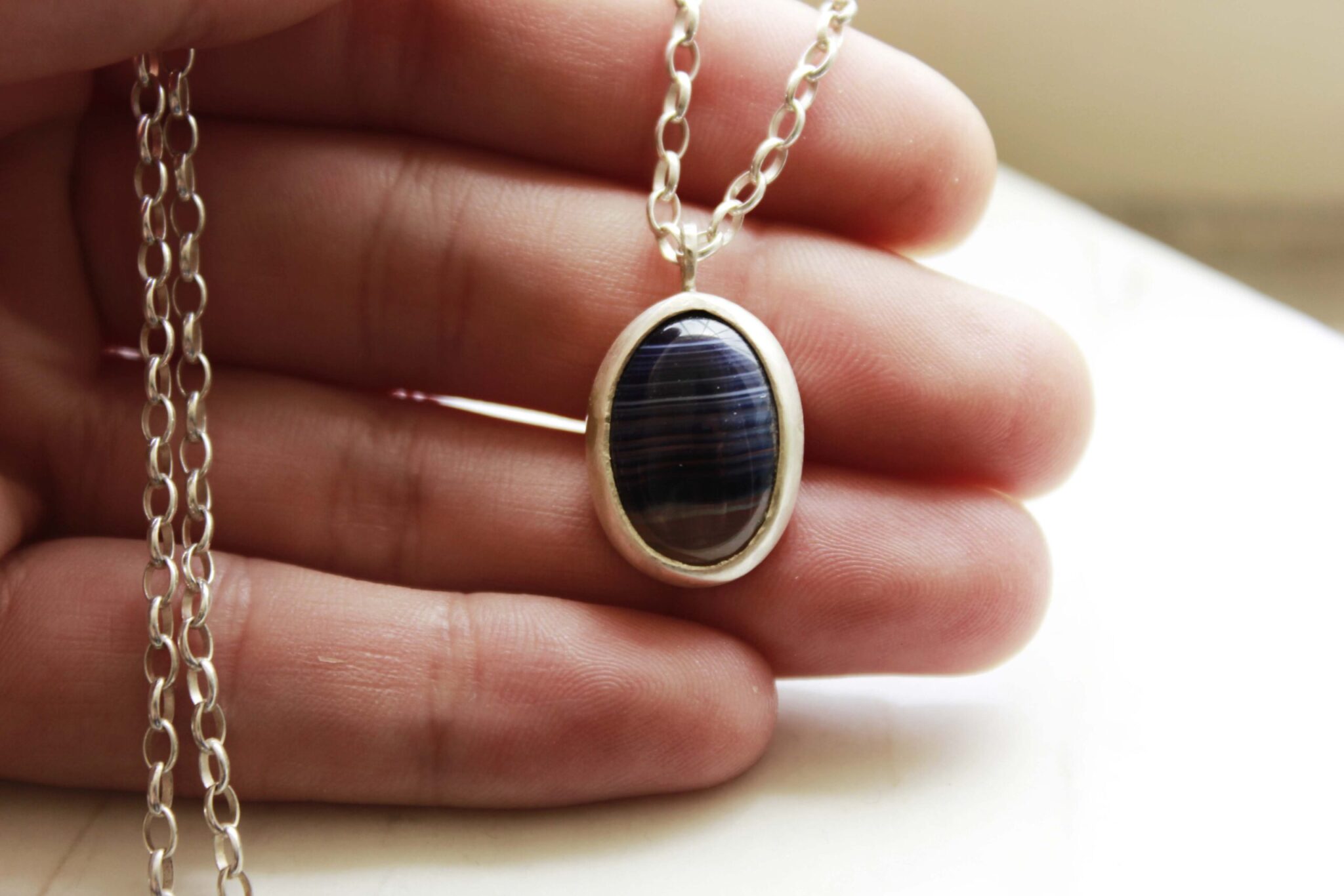A classic blue agate stone necklace, hanging from a sterling silver chain.