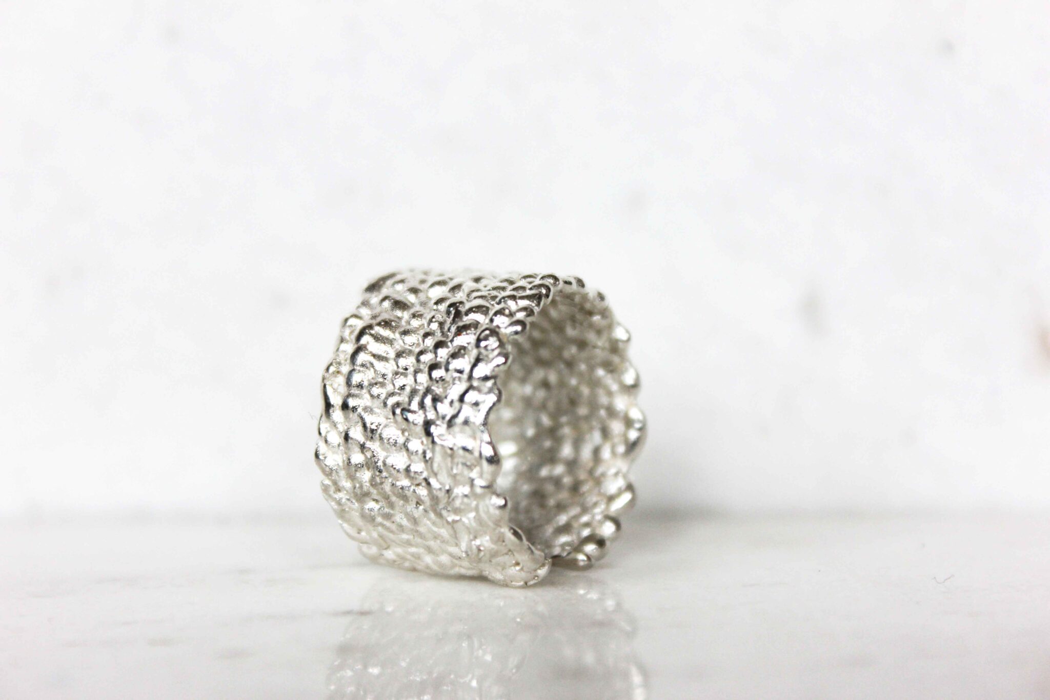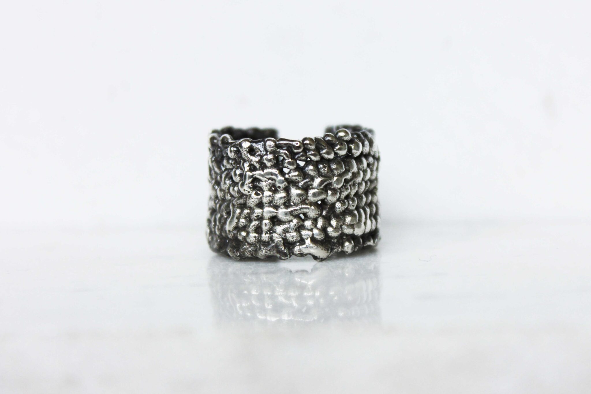 A chunky silver ring with a textured organic feel.