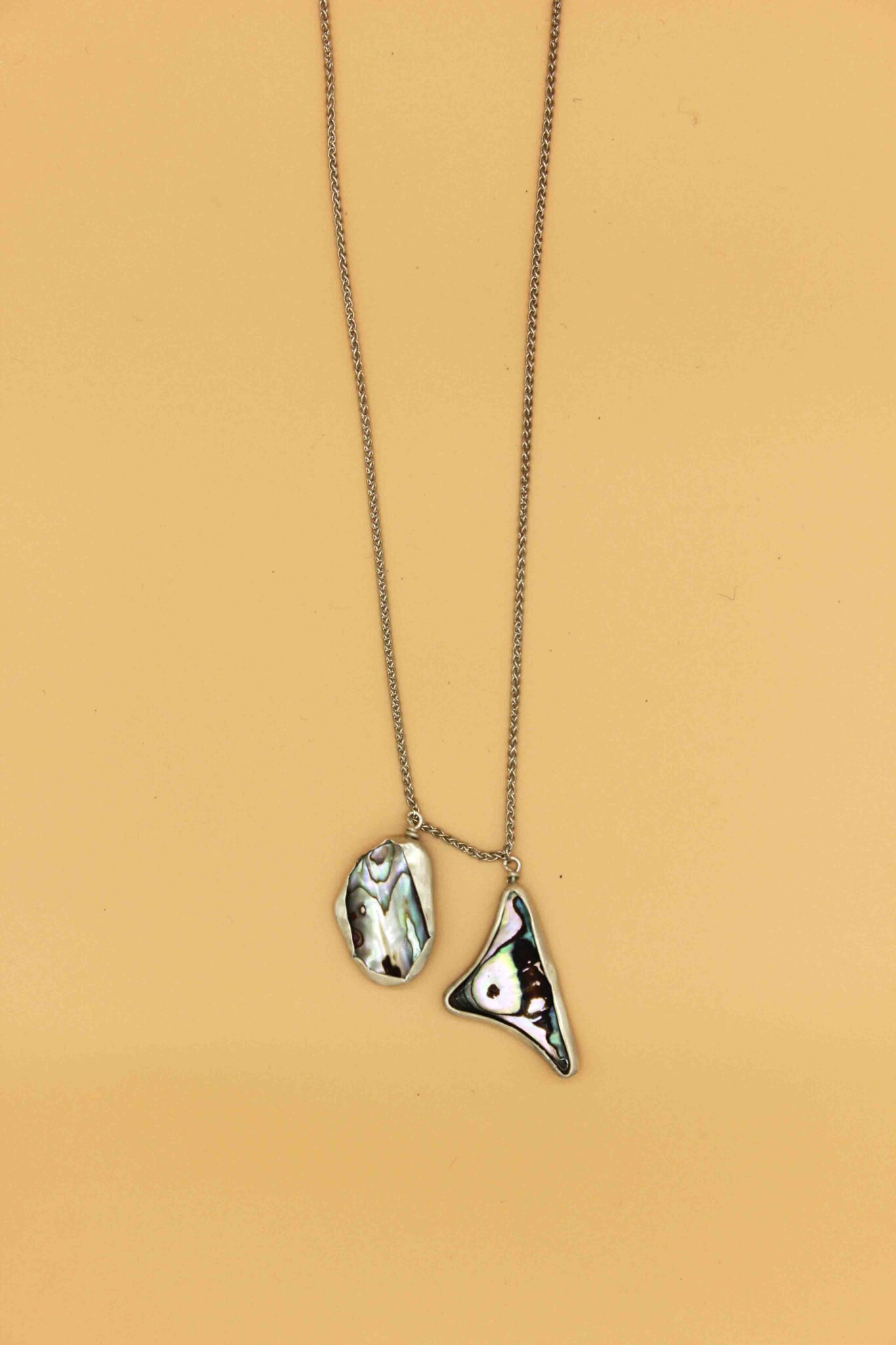 Colourfull long necklace featuring two abalones.