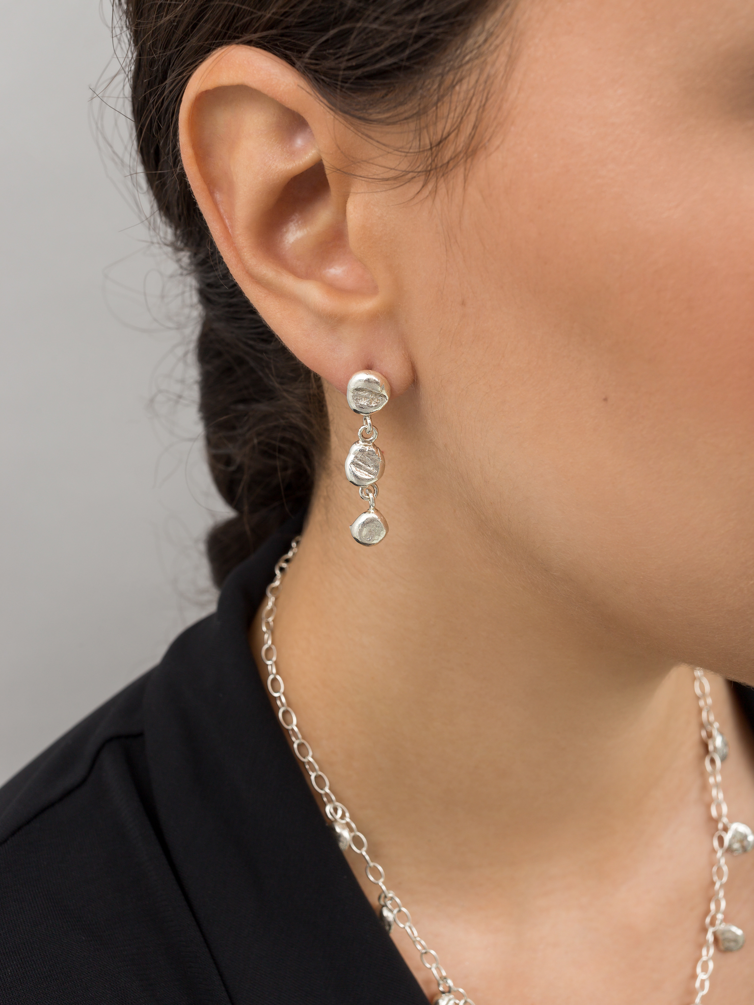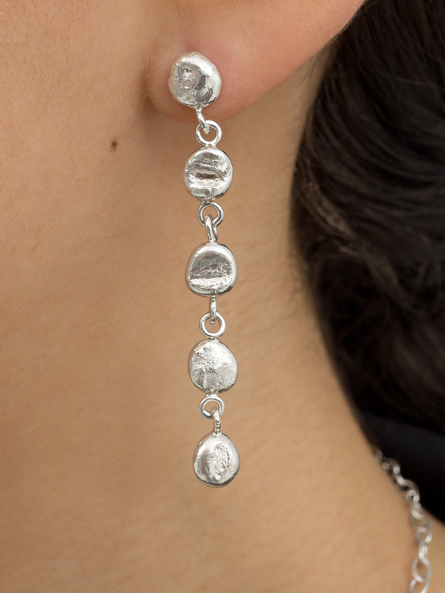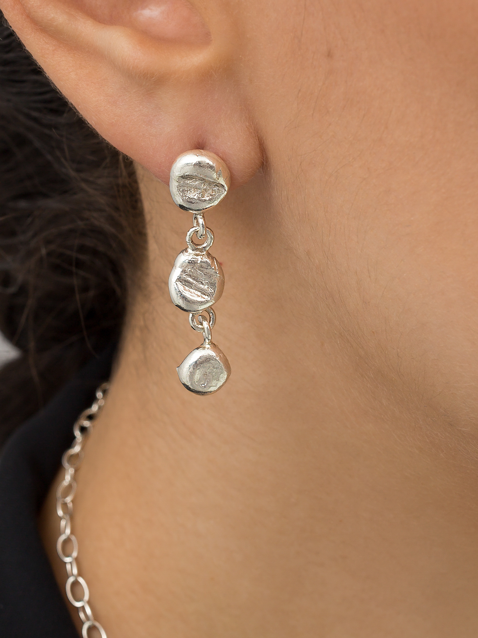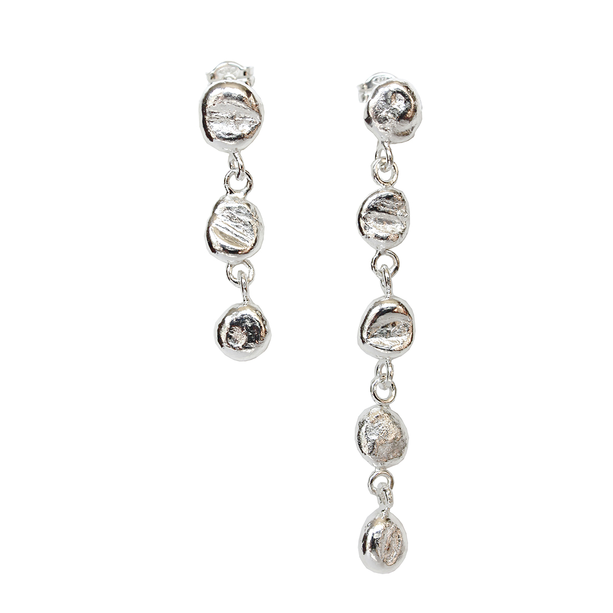 The earrings consist of hand melted silver balls.