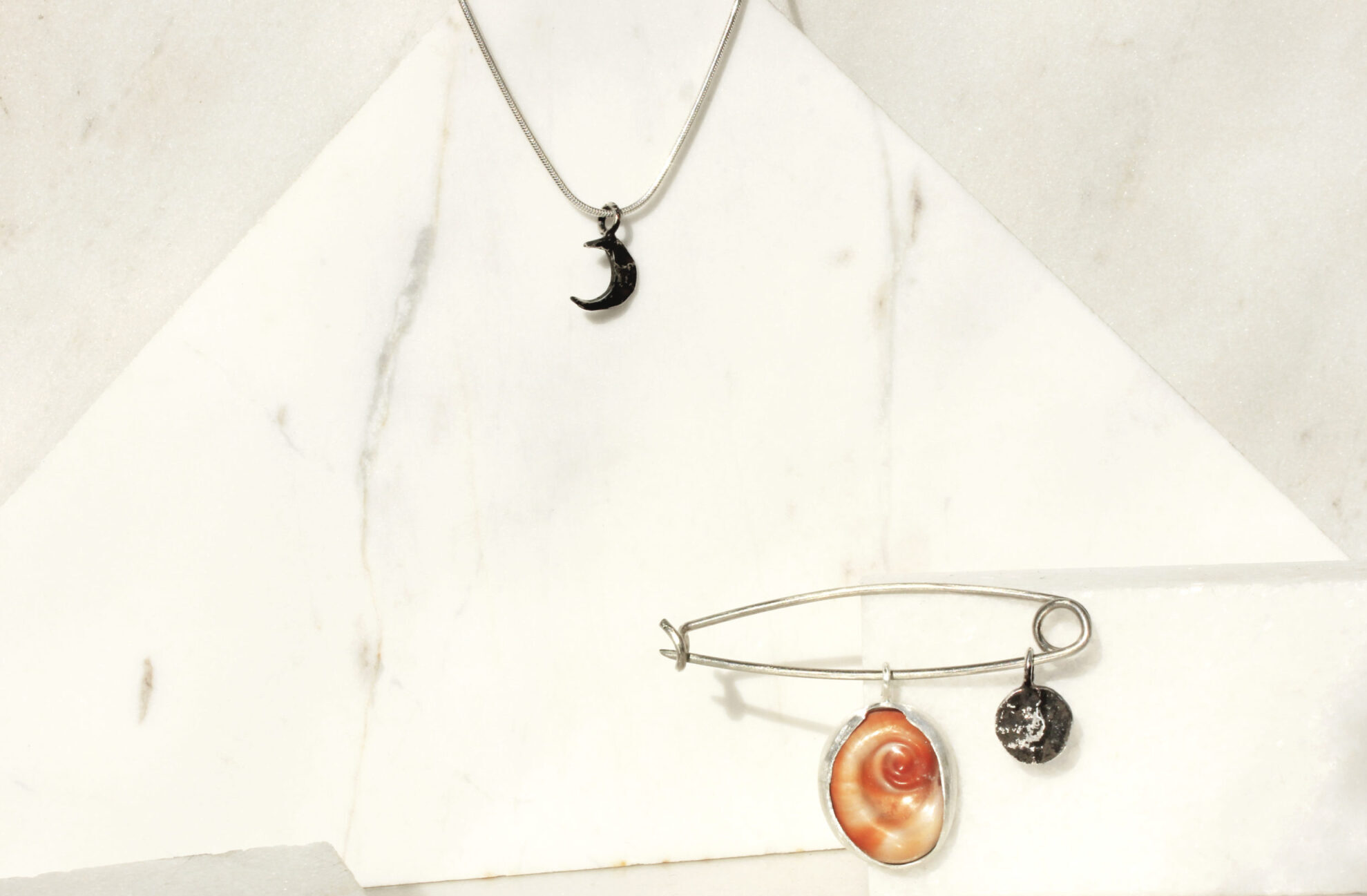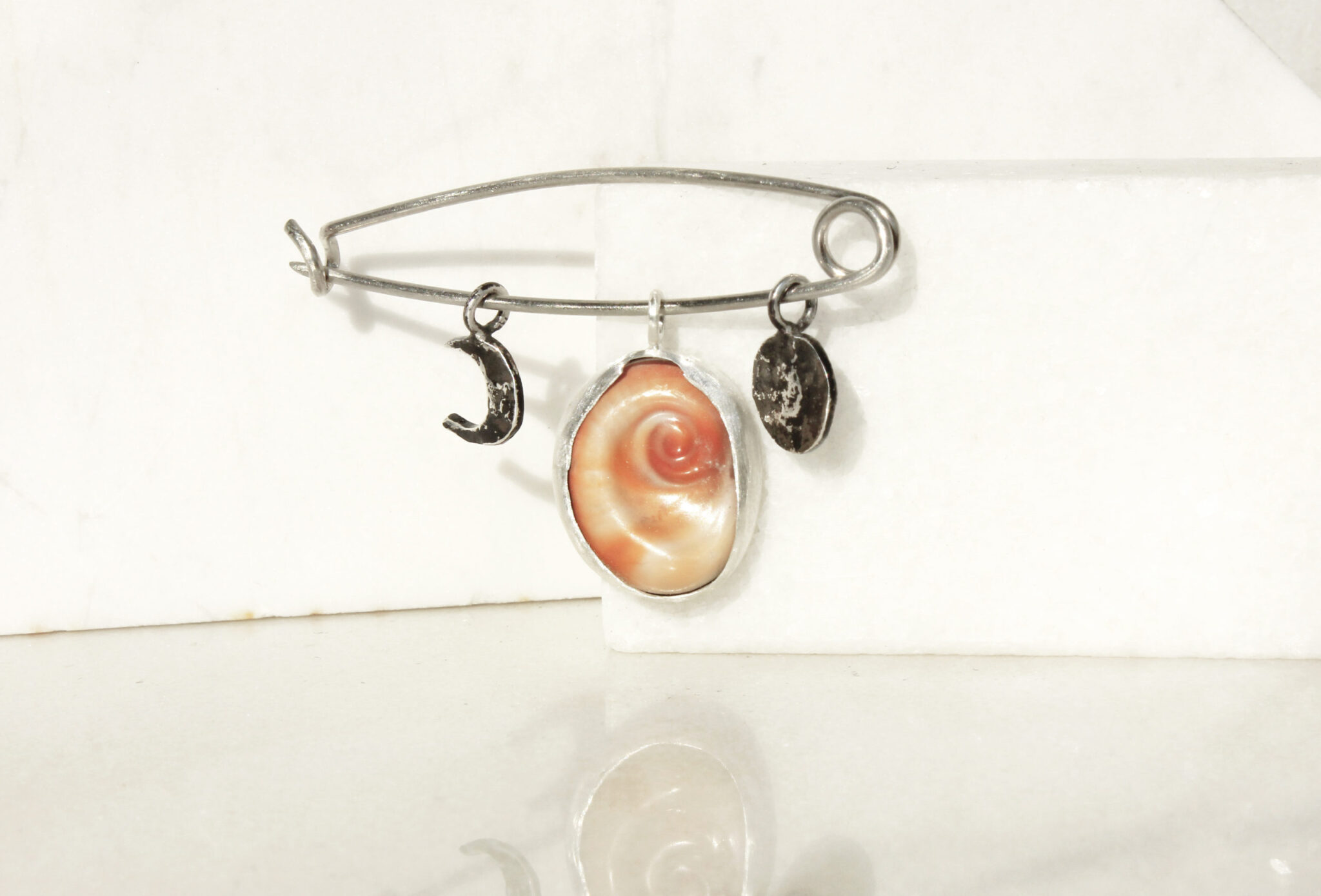 This safety pin charm contains three elements: a sea eye set in sterling silver, a half and a full moon made from burnt sterling silver.