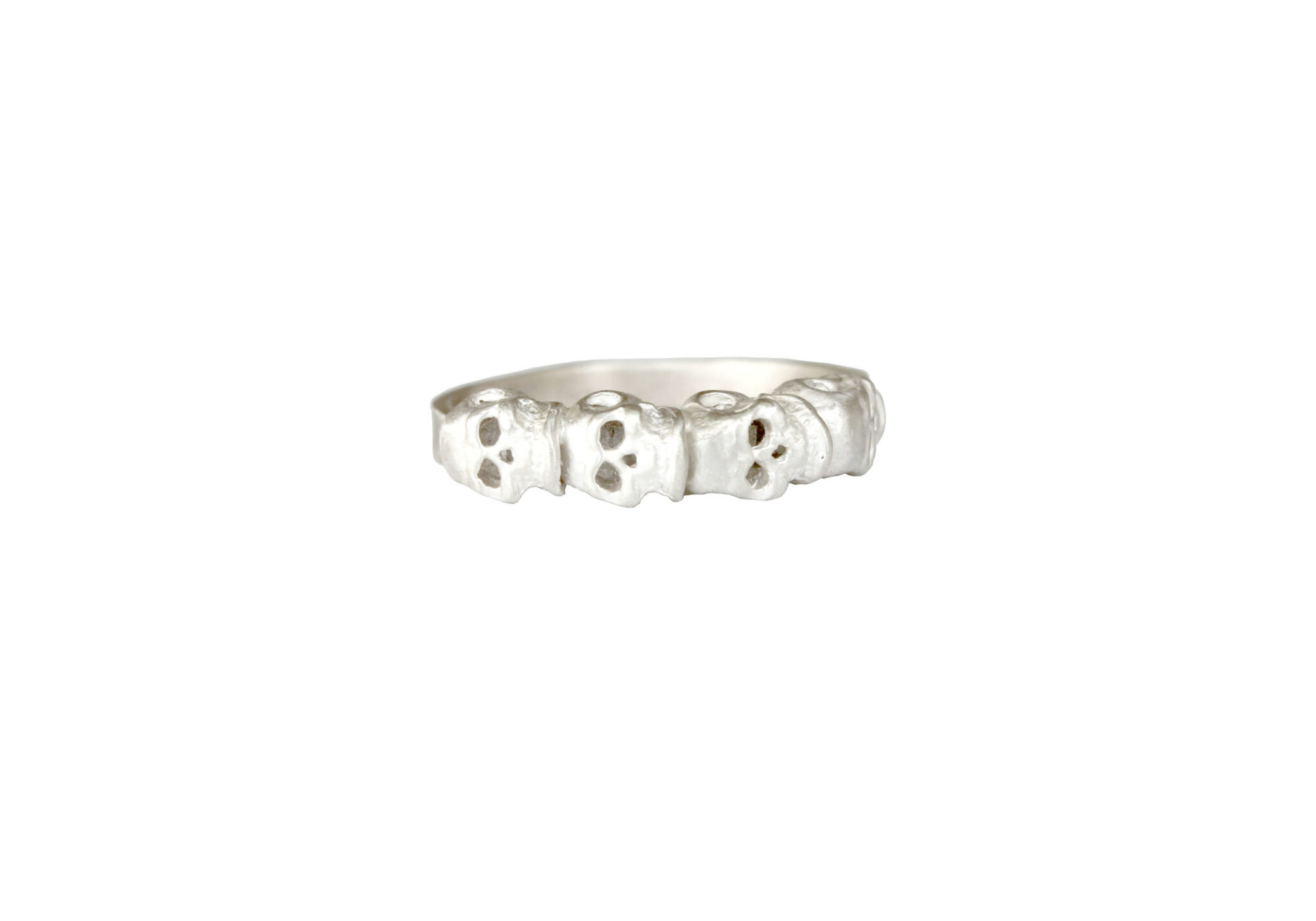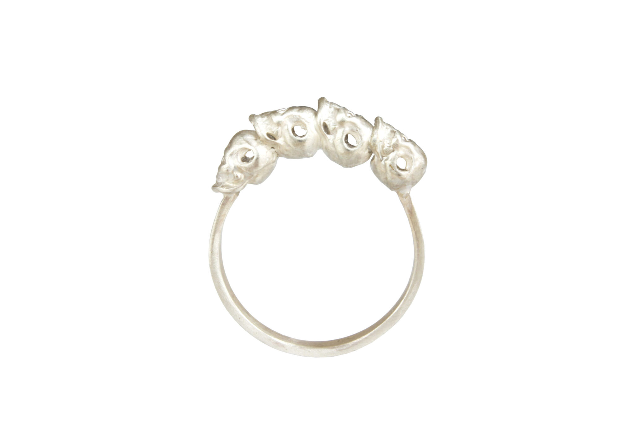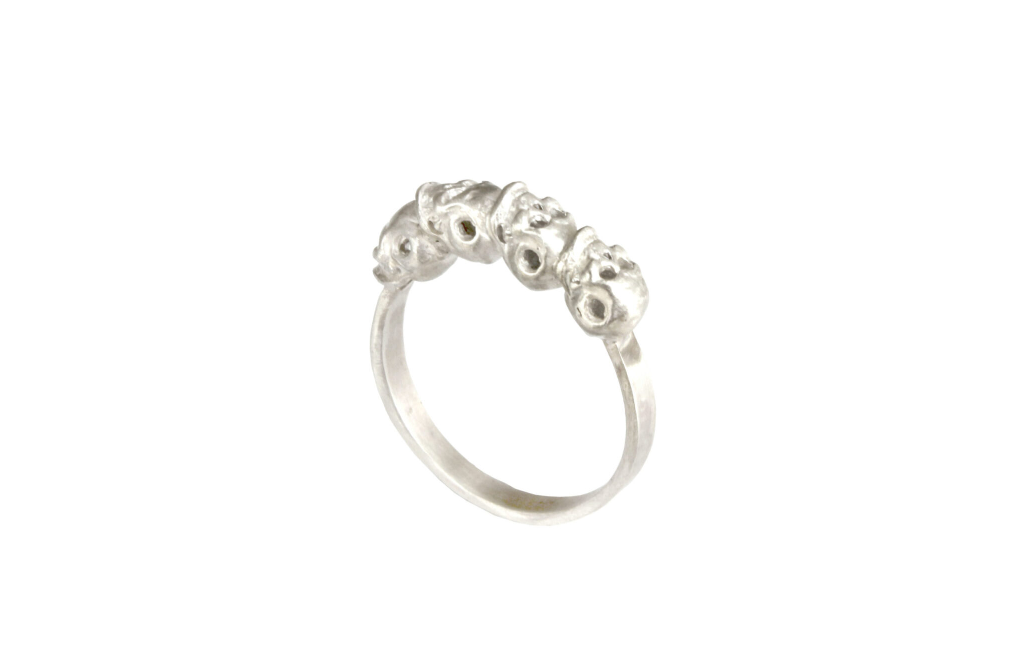 A contemporary silver skull ring featuring a row of four skulls.